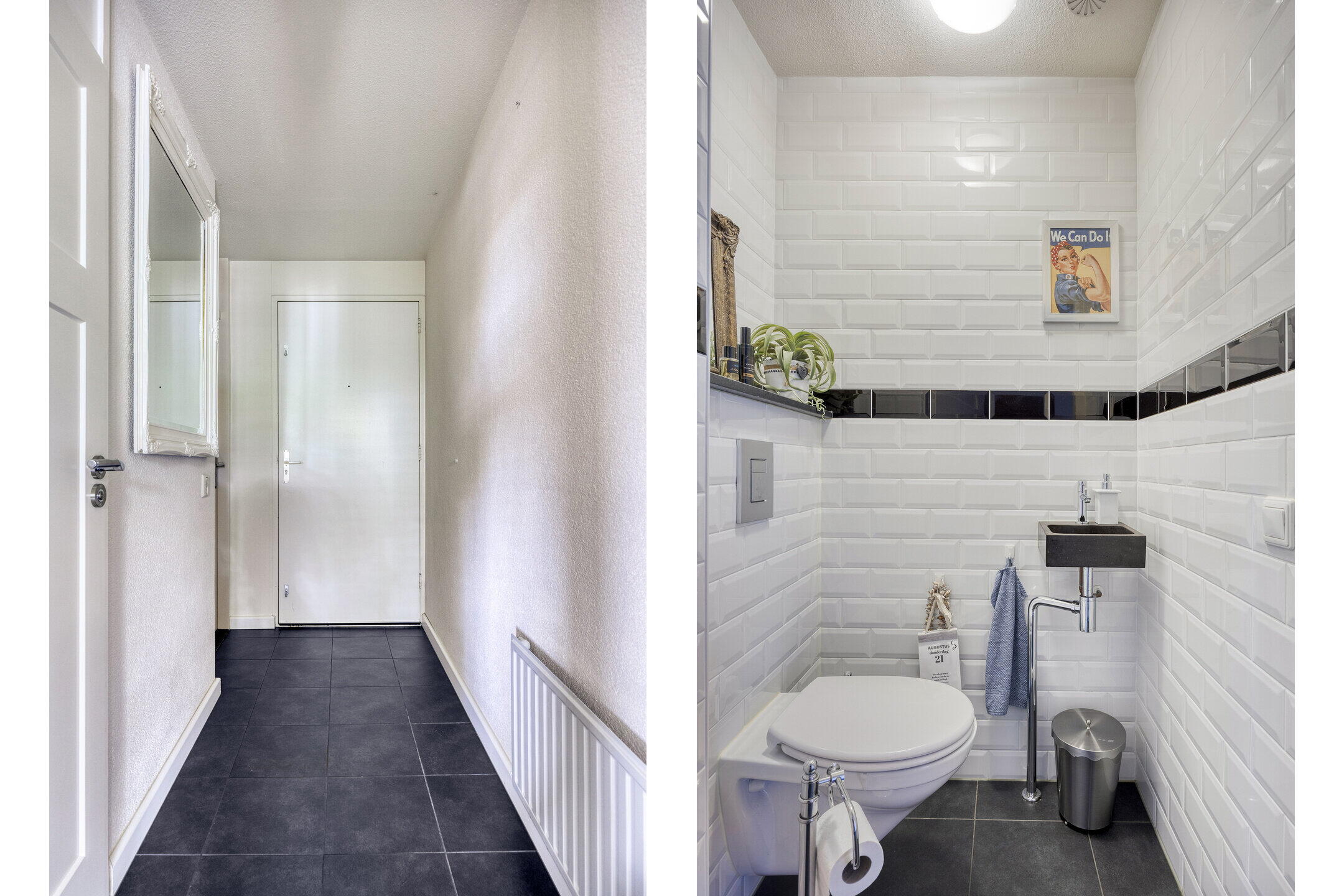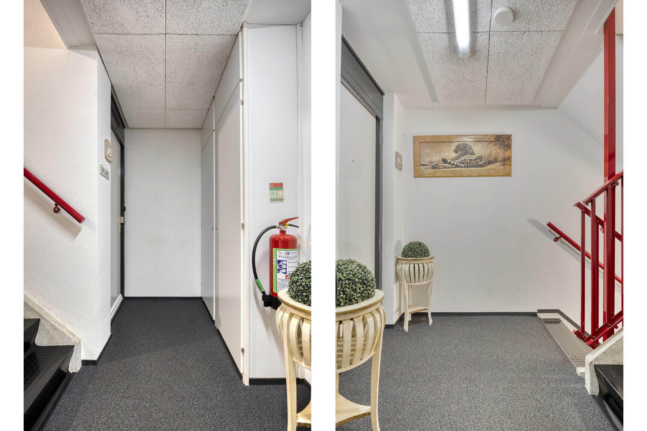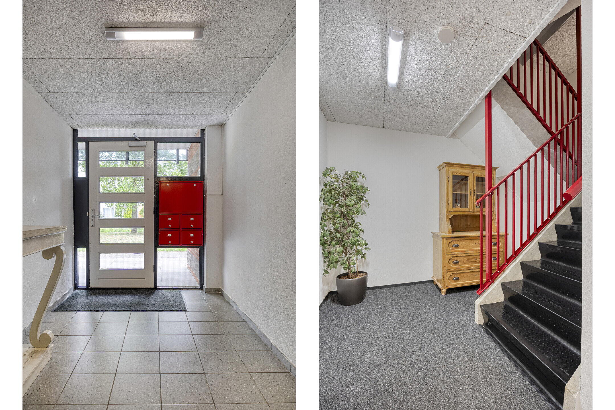 Je komt het appartementencomplex binnen via een verzorgde, gezamenlijke hal. Via de trap bereik je de eerste verdieping, waar het appartement is gelegen. Binnenkomst in een lange hal die direct toegang biedt tot de woonkamer, badkamer, toilet en beide slaapkamers – praktisch én overzichtelijk.