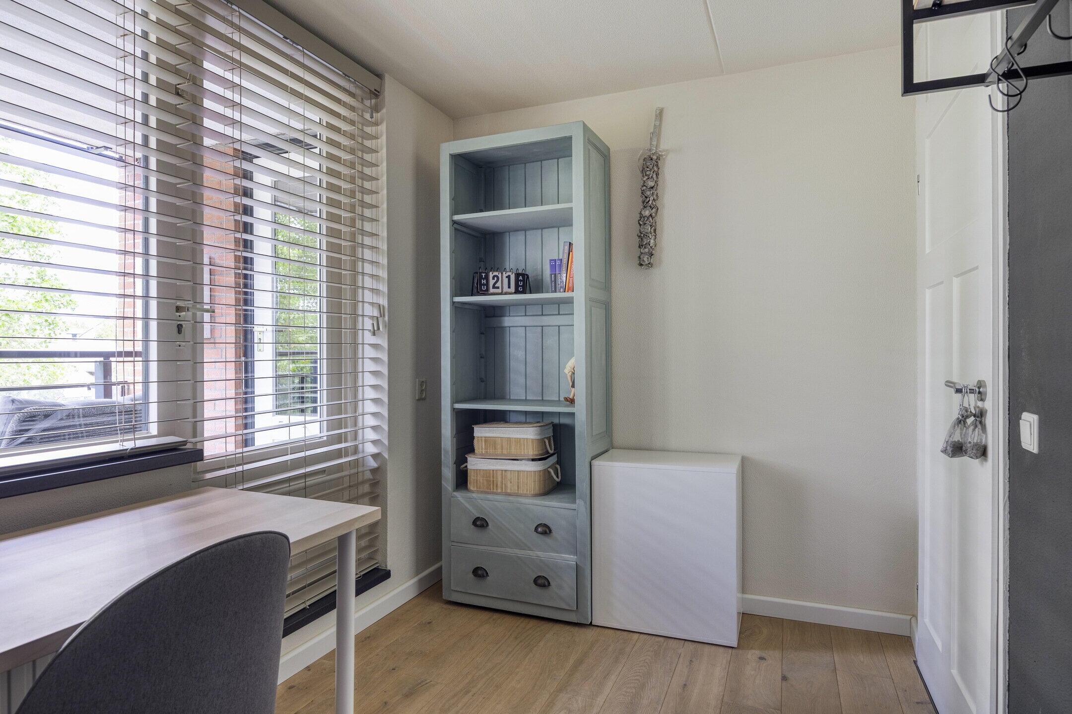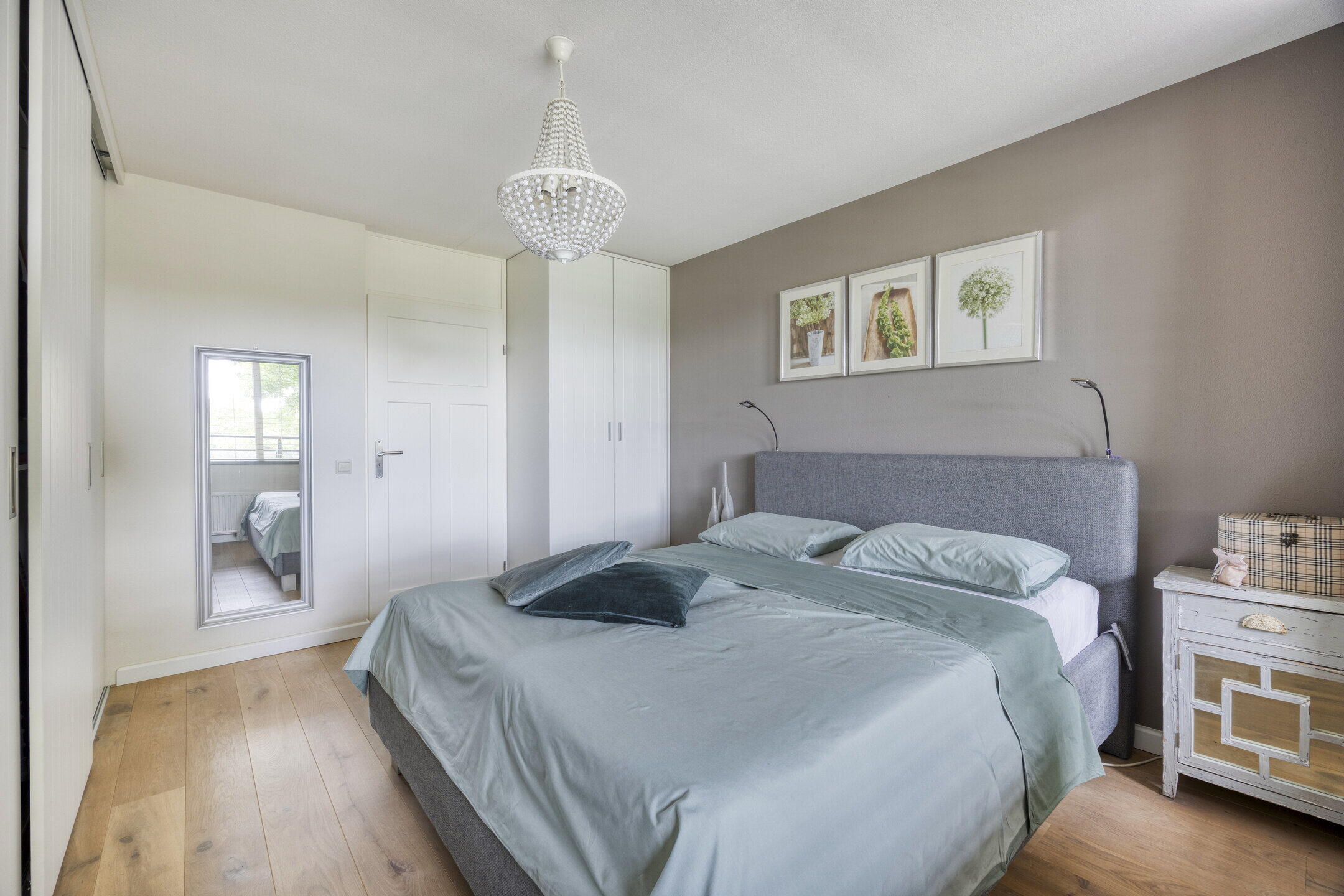 De master bedroom is groot genoeg voor een tweepersoonsbed, beschikt over een zeer ruime vaste kastenwand (5 delen) én heeft directe toegang tot een van de balkons. Daarnaast is er nog een extra kast aanwezig, waardoor er volop bergruimte is en de nieuwe bewoners al hun kleding hier moeiteloos kwijt kunnen. De tweede slaapkamer is iets compacter, maar ook hier vind je een deur naar het balkon – ideaal als logeer-, werk- of hobbykamer. De badkamer is stijlvol en praktisch ingericht met een inloopdouche, badkamermeubel met houtlook, wastafel en extra kastruimte. Alles afgewerkt in een rustige, natuurlijke stijl.