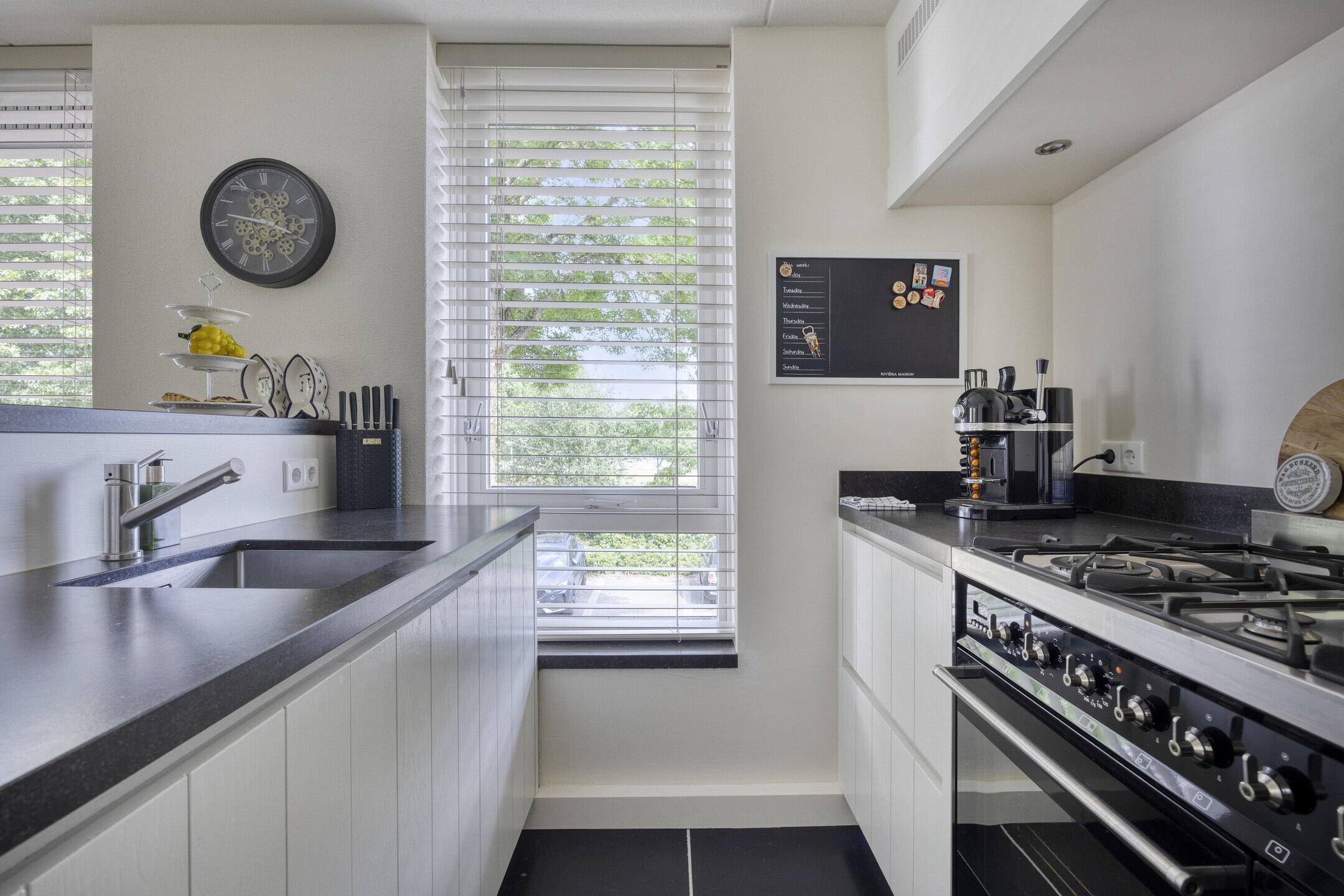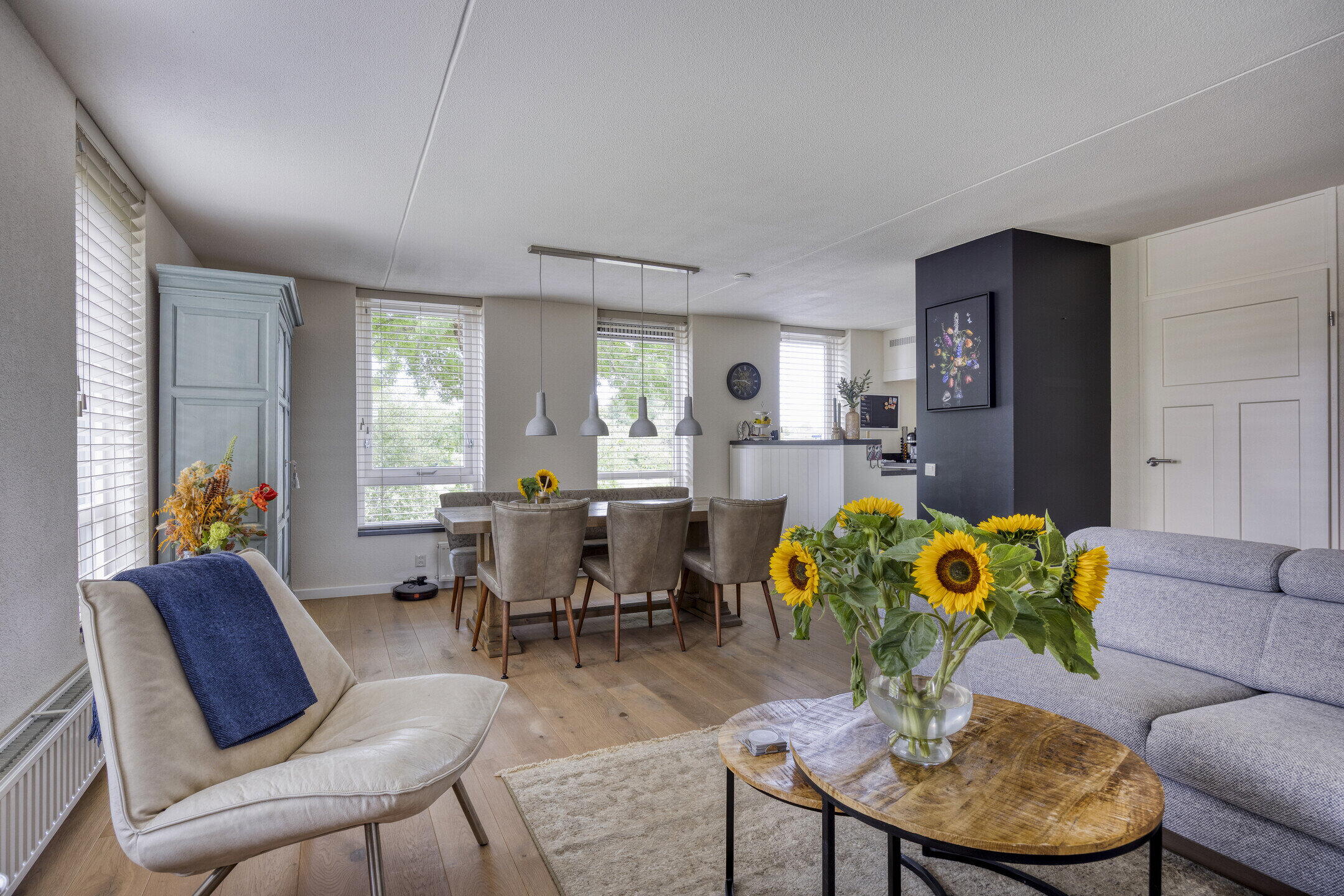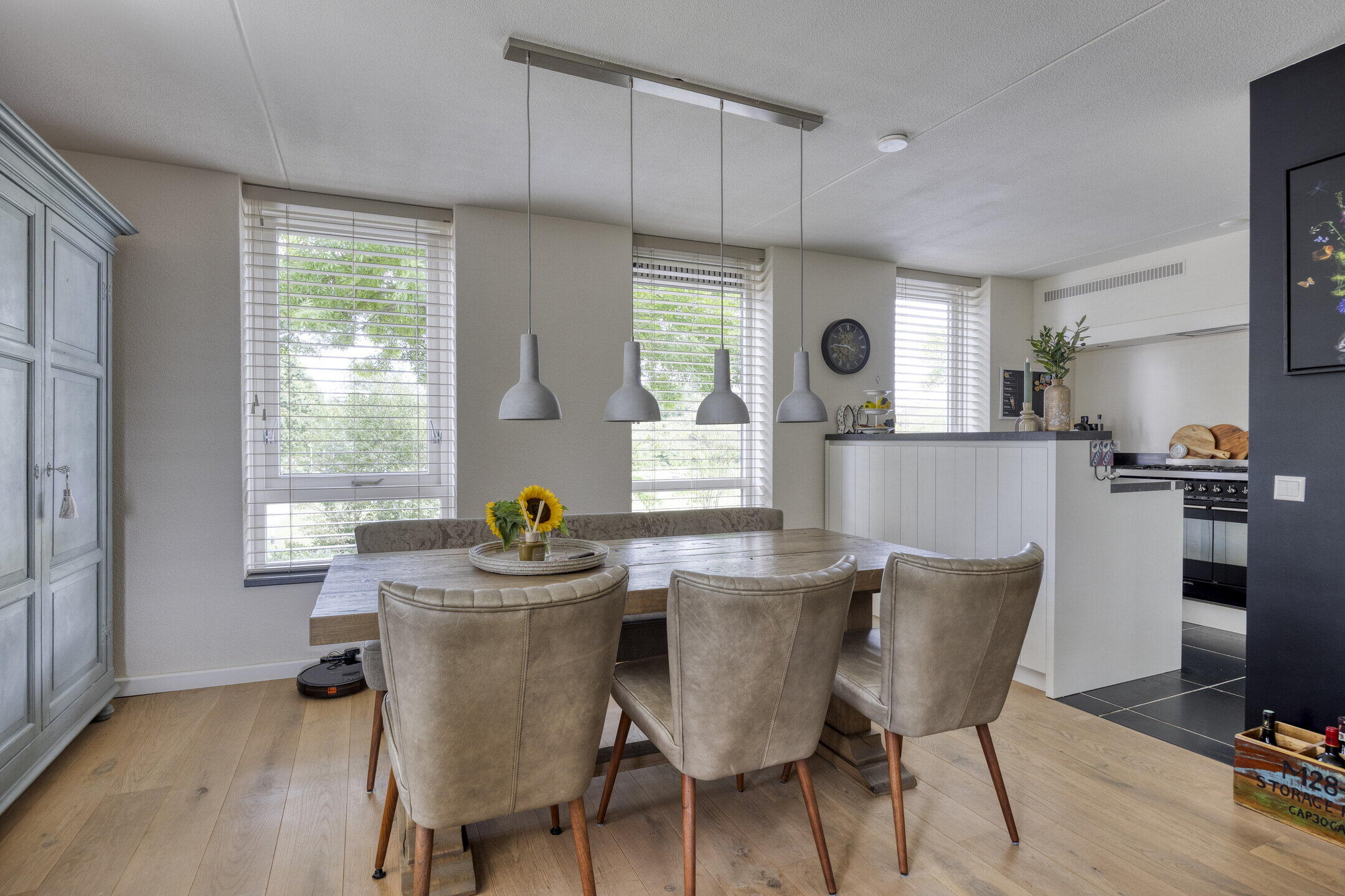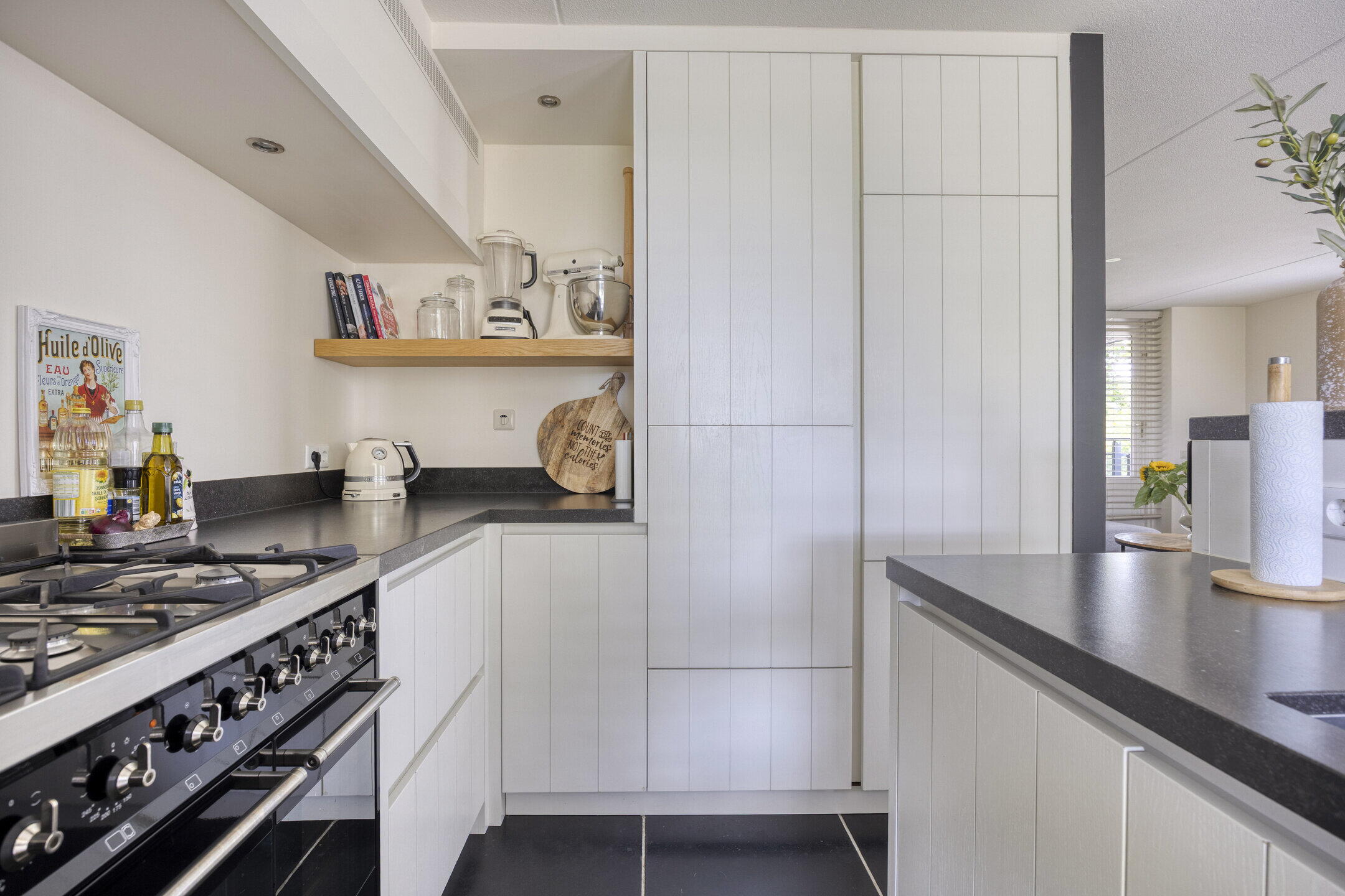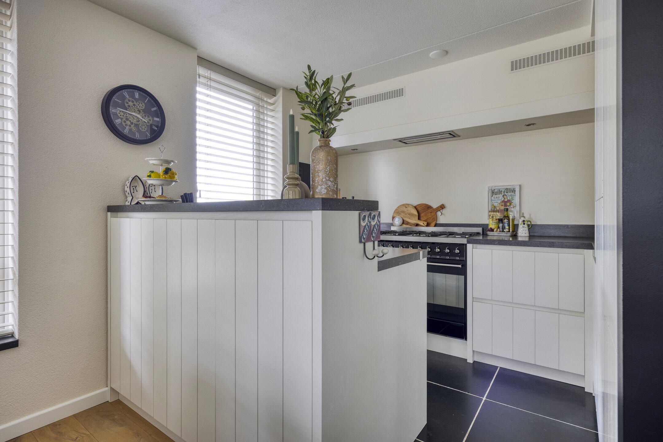 De woonkamer voelt heerlijk ruim en licht dankzij grote raampartijen. Er is volop plek voor een gezellige zithoek én een royale eettafel. De houten vloer geeft warmte en sfeer. Vanuit hier heb je toegang tot een handige berging met wasmachineaansluiting én het eerste balkon – deze sluit direct aan op de tweede slaapkamer. De open keuken sluit naadloos aan op de woonkamer en heeft een landelijke uitstraling met een moderne twist: wit met zwarte accenten, greeploze fronten en veel bergruimte. Natuurlijk compleet met fornuis, afzuigkap, oven, koel-vriescombinatie én vaatwasser op hoogte.